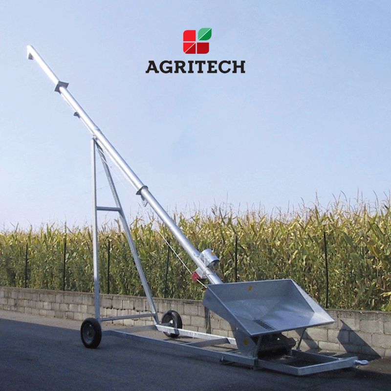 Vis sur chariot en fer galvanisé à chaud avec grande trémie réglable et moteur à l’extrémité inferieure. Attelage et anneau de traction. Palier intermédiaire graissable et boîtier inverseur